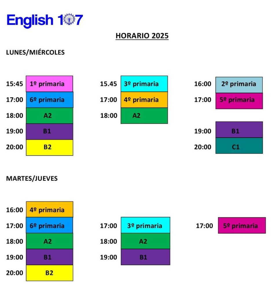 Las clases empiezan de 16:00 a 21:30, depende del nivel. Haga clic en el enlace para ver el horario del curso de 2025/2026.